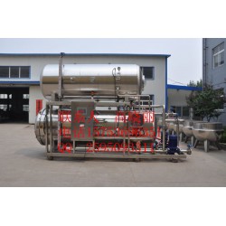 豆制品殺菌鍋,玉米高溫殺菌鍋工作原理:在熱水池內(nèi)用蒸汽將水溫升至沸騰,啟動水泵用大口徑流量管道把熱水抽到鍋內(nèi)進行直接殺菌。在熱水達(dá)到一定水位時,隨即啟動熱水循環(huán)泵,把鍋內(nèi)熱水進行循環(huán),采用三點出水八點進水的方式,在循環(huán)時,為了確保鍋內(nèi)出水點的均勻,采用了三點串聯(lián)式.循環(huán)水經(jīng)水汽交換消音器快速升溫(使用此類水汽交換消音器,避免在鍋內(nèi)加溫時,蒸汽和貨物的直接接觸,使部分貨物溫度偏高),再通過鍋內(nèi)八個進水點(上、下、左、右各兩點),使熱水直接達(dá)到殺菌鍋內(nèi)進行循環(huán)。在鍋內(nèi)熱水進行循環(huán)的同時,蒸汽角座閥自動開啟進行鍋內(nèi)升溫,在即將達(dá)到溫度時,通過溫度變送器準(zhǔn)確的把鍋內(nèi)溫度輸送到溫控儀,控制蒸汽角座閥進行溫度調(diào)節(jié),此調(diào)節(jié)閥是根據(jù)鍋內(nèi)溫度的升降進行逐步調(diào)節(jié),以防止鍋內(nèi)到達(dá)溫度時,溫度反沖。在達(dá)到設(shè)定溫度的同時,關(guān)閉蒸汽角座閥門,進入產(chǎn)品殺菌階段(不同產(chǎn)品殺菌時間可調(diào))。在到達(dá)殺菌時間后,報警器會報警提醒,打開出水閥及水泵,把鍋內(nèi)熱水用水泵輸送到熱水池,下一鍋殺菌時循環(huán)使用。產(chǎn)品進入冷卻階段,開啟水泵,把涼水輸送到鍋內(nèi),達(dá)到設(shè)定水位時停止,隨即打開循環(huán)閥門,把鍋內(nèi)涼水進行循環(huán),使產(chǎn)品溫度均勻下降。如工作時間較長,鍋內(nèi)涼水降不下溫時,打開溢水閥,把鍋內(nèi)上部熱水排出,同時其它涼水進入,以達(dá)到降溫目的。鍋內(nèi)壓力由壓力變送器隨著鍋內(nèi)壓力的升降,把信號輸送到壓力控制儀,進行鍋內(nèi)壓力自動調(diào)整,使鍋內(nèi)壓力始終處于在規(guī)定的范圍內(nèi)。如超出,可自動停止;如下降,可自動加壓保護。使鍋內(nèi)產(chǎn)品處于同等壓力下進行殺菌。在鍋內(nèi)達(dá)到工藝設(shè)定的冷卻溫度后,隨即把鍋內(nèi)涼水排出,卸掉鍋內(nèi)壓力,殺菌完畢。操作人員打開連鎖裝置,開啟鍋門取貨。一系列操作完畢。