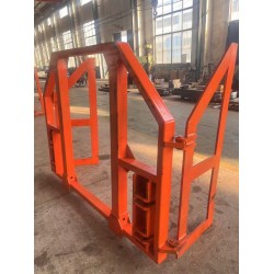 機(jī)載臨時支護(hù)裝里主要由翻轉(zhuǎn)梁(左右)、升降油缸(左右)和頂梁、翻轉(zhuǎn)油缸、支撐油缸、輔助支撐油缸、操作閥組等構(gòu)成。其中只有項(xiàng)梁、前支撐缸在收攏狀態(tài)時匍甸在掘進(jìn)機(jī)切割電機(jī)背部,而上述其余部件均布置在切割部兩側(cè)。它是利用切割部的前、后銷軸,把左、右翻轉(zhuǎn)梁牢固的安裝在掘進(jìn)機(jī)上,在轉(zhuǎn)梁下部安裝著翻轉(zhuǎn)油缸、升降油缸,缸簡上安裝著一對支撐油缸。操作翻轉(zhuǎn)油缸和支撐油缸控制閥,使翻轉(zhuǎn)梁翻轉(zhuǎn)至掘進(jìn)機(jī)切割頭前方,操作升降油缸,推動頂梁去接觸巷道頂板起到預(yù)支撐作用,將前支撐缸回轉(zhuǎn)至垂直位置,人工安裝輔助支撐桿后,將輔助支缸牢固的支撐在地面上,為下一步錨桿作業(yè)提供了安全空間。所有油缸都為插裝式液壓鎖,有效保障了萬一軟管發(fā)生爆裂故障時的設(shè)備和人員安全。