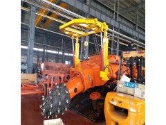 機(jī)載臨時支護(hù)裝里主要由翻轉(zhuǎn)梁(左右)、升降油缸(左右)和頂梁、翻轉(zhuǎn)油缸、支撐油缸、輔助支撐油缸、操作閥組等構(gòu)成。其中只有項梁、前支撐缸在收攏狀態(tài)時匍甸在掘進(jìn)機(jī)切割電機(jī)背部,而上述其余部件均布置在切割部兩側(cè)。它是利用切割部的前、后銷軸,把左、右翻轉(zhuǎn)梁牢固的安裝在掘進(jìn)機(jī)上,在轉(zhuǎn)梁下部安裝著翻轉(zhuǎn)油缸、升降油缸,缸簡上安裝著一對支撐油缸。操作翻轉(zhuǎn)油缸和支撐油缸控制閥,使翻轉(zhuǎn)梁翻轉(zhuǎn)至掘進(jìn)機(jī)切割頭前方,操作升降油缸,推動頂梁去接觸巷道頂板起到預(yù)支撐作用,將前支撐缸回轉(zhuǎn)至垂直位置,人工安裝輔助支撐桿后,將輔助支缸牢固的支撐在地面上,為下一步錨桿作業(yè)提供了安全空間。所有油缸都為插裝式液壓鎖,有效保障了萬一軟管發(fā)生爆裂故障時的設(shè)備和人員安全。
