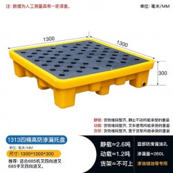 1313防滲漏高款四桶托盤擁有大面積儲漏空間,可有效處理化學危廢物液體,四桶代表托盤表面可放四個油桶或其他處理桶,托盤表面采用防滑紋理設計,有效增加產品與貨物之間摩擦性能,提高安全性,防止貨物滑落,底部采用全密封大空間大平面設計,擁有大面積儲漏空間的同時更易清洗,一沖即凈。腿部設有排泄開孔,可從腳部一次性進行危廢液體排泄,**快捷,排泄干凈。